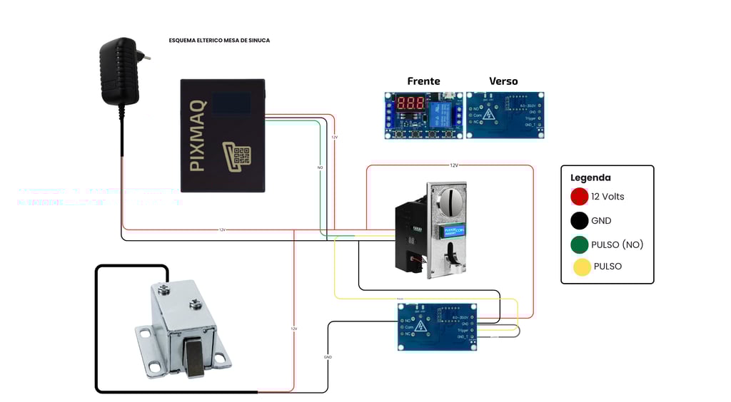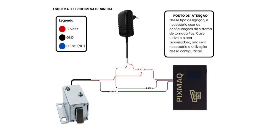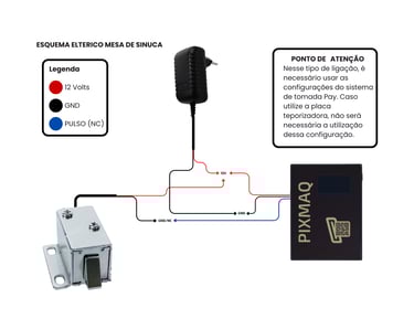Alimentação (12VDC - Condutor Vermelho): A tensão de 12 Volts proveniente da fonte de alimentação deve ser ramificada, alimentando em paralelo o módulo PIXMAQ e um dos terminais do atuador solenoide.